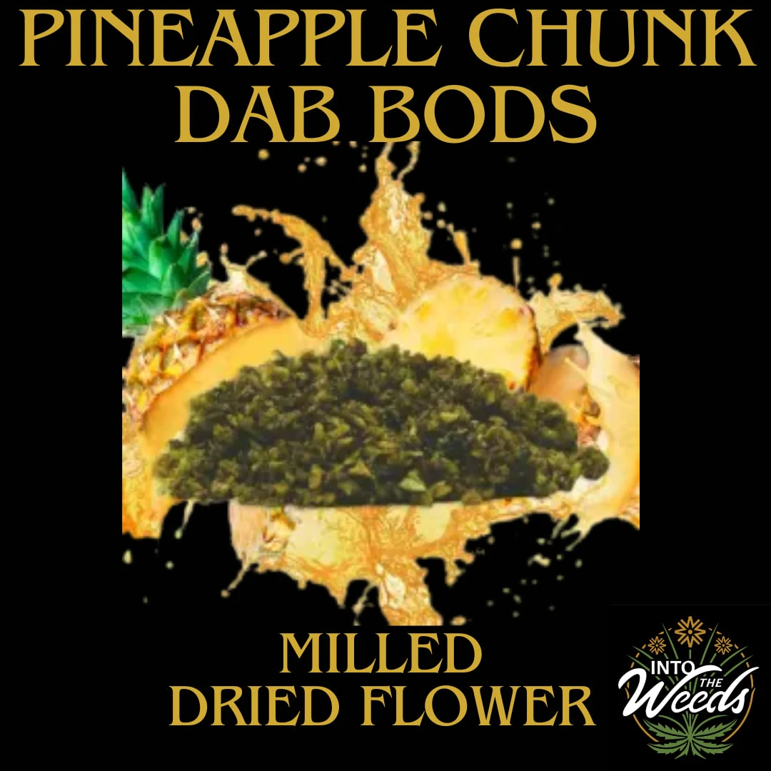 Dab Bods Resin Infused Milled Flower, craft bud infused with our top selling resin. featuring the popular “Pineapple Chunk” – a hybrid strain that has been known to creep up on people with relaxing body effects and tingly head high. Robust flavours of cheese and earthy skunk explode out of this 2.0 gram format, providing you a perfect combination of concentrate and dried flower!