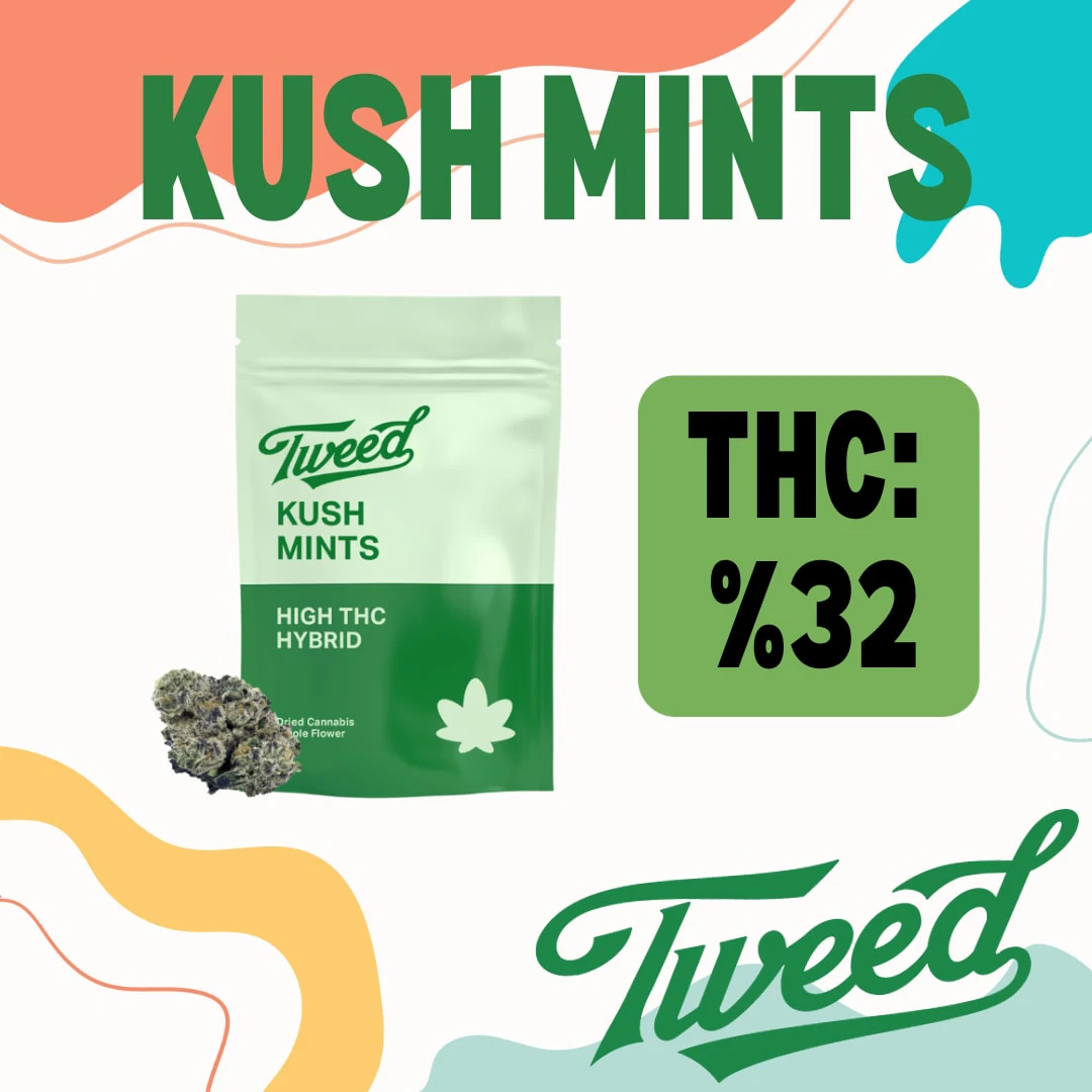 Tweed Kush Mints is a hybrid strain with high THC and minimal amounts of CBD. Kush Mints comes from a cross of Animal Mints and Bubba Kush. Its buds are known to be dense and dark green, and hits of lime. Some associate minty, earthy, and pine flavours with the Tweed Kush Mints strain.