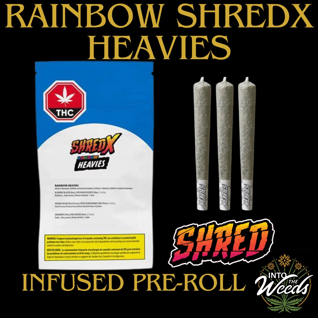 Introducing SHRED X Rainbow Heavies. The best way to try out a few of our potent diamond, distillate and terpene infused pre-rolls. Blueberry Blaster, Mother Pucker Peach and Gnarberry. Each in their own colour coded tube so you know what's what.