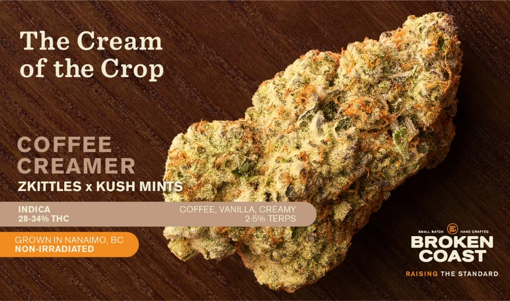 Inspired by the smoothest part of your morning ritual, Coffee Creamer is a cultivar worth savouring. This Seed Junky genetic is a decadent indica with rich, creamy coffee and vanilla flavours. This Zktlz x Kush Mints cross pairs old school depth with dessert-like nuance for a taste that lingers. Coffee Creamer delivers a bold potency and flavour with high THC. The buds are dense, frosty and hand trimmed to perfection, grown in laboratory grade, strain specific rooms, hang dried, cold cured, hand packaged with care and never irradiated.?From the first crack to the final exhale, the vibrant vibes of Coffee Creamer are craft excellence you can taste.