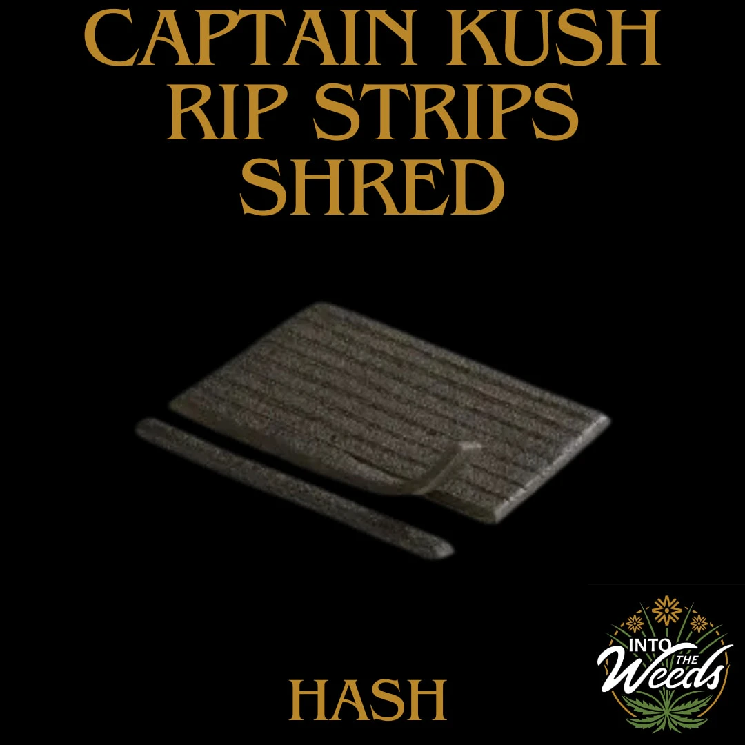 SHRED X Captain Kush Rip-Strip hash is a piece of botanical terpene-infused hash pressed flat and cut into 10 easy-to-use hash strips. For added flavour and potency in your roll or bowl, simply rip it and strip it. It has the distinctive gassy, floral Kush-like aromas of Captain Kush.