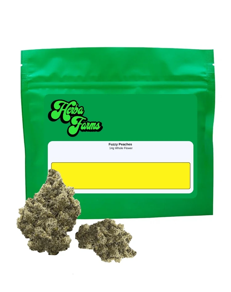Strain: Fuzzy Peaches Lineage (Cross): OZ Kush x Peach Breeder: Herba Farms Origin: Saskatchewan Cannabis species: Indica-Dominant Hybrid THC %: 29.3% Other cannabinoids %: CBD = 0.06% TOTAL cannabinoids %: 33.4% Terpene %: 3.42% Terpene by potency: Limonene, Myrcene, Linalool, Caryophyllene, Terpinolene, Humulene. Cultivation brand: Herba Farms Lead Cultivator: Taylor Hogberg Grow medium: RDWC (Recirculating Deep Water Culture) Lamps: LED Processes: IPM Organic (Y/N): No Environment: Indoor Quality Assessment: Fruit forward genetics with balanced effects Nose notes: Citrus, Berries, Peaches, Diesel, Pine Flavour notes: Sweet, Citrus, Peachy Berries, Pine Smoothness notes: Peachy Diesel Herba Farms new Fuzzy Peaches is a delicious indica-dominant hybrid that combines the best of both worlds with an uplifting, euphoric high and just the right amount of relaxation. Its sweet, fruity peach flavor and tangy citrus notes come from limonene, while the myrcene provides a smooth, mellow vibe that keeps you feeling comfortable. A touch of linalool adds a floral, calming element, making it perfect for stress relief or sparking creativity. Whether you’re hanging out with friends or tackling your to-do list, Fuzzy Peaches gives you the perfect balance of feel-good effects and a tasty, flavorful experience