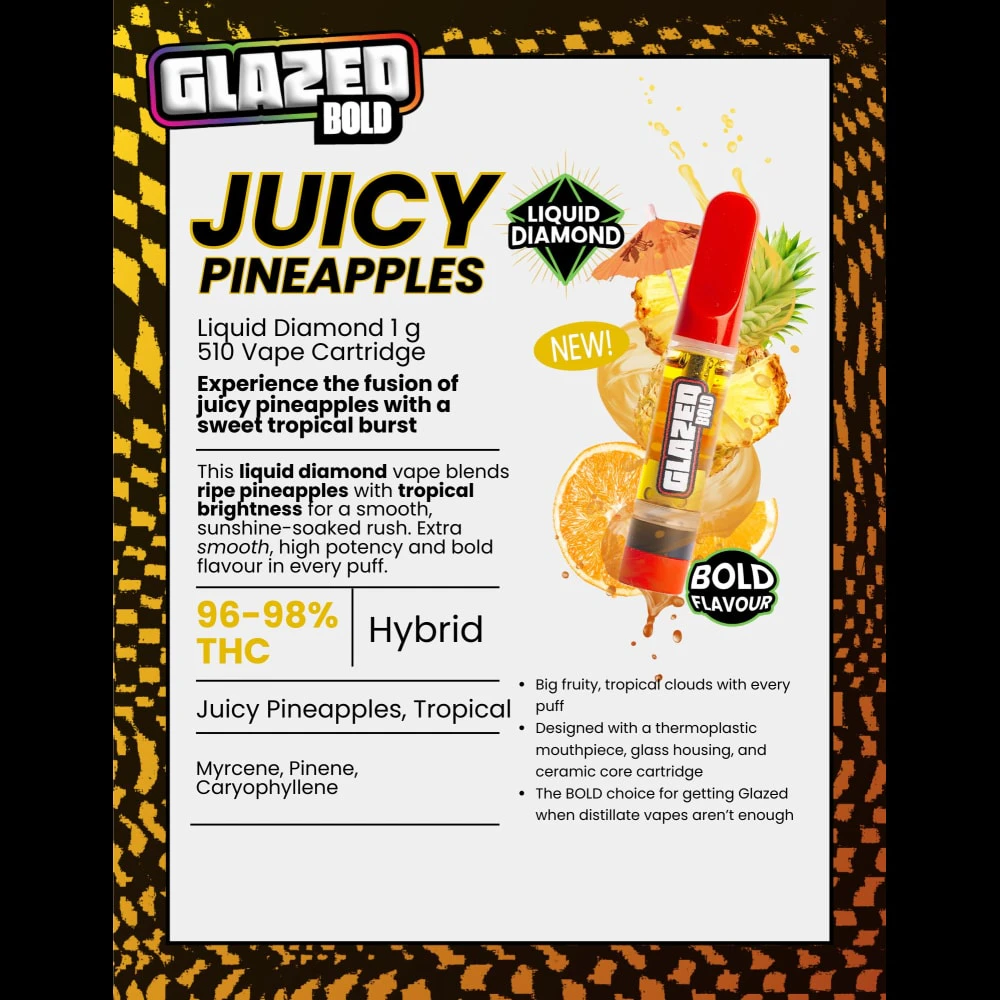 TERPENES: Myrcene, Pinene, Caryophyllene GLAZED Juicy Pineapples Liquid Diamond vape delivers a high-potency blast of ripe pineapples and tropical brightness. Every puff bursts with golden fruit flavour and juicy nectar for a smooth, sunshine-soaked rush that’s bold, sweet, and mouth-watering. The BOLD option for when distillate vapes aren't enough.