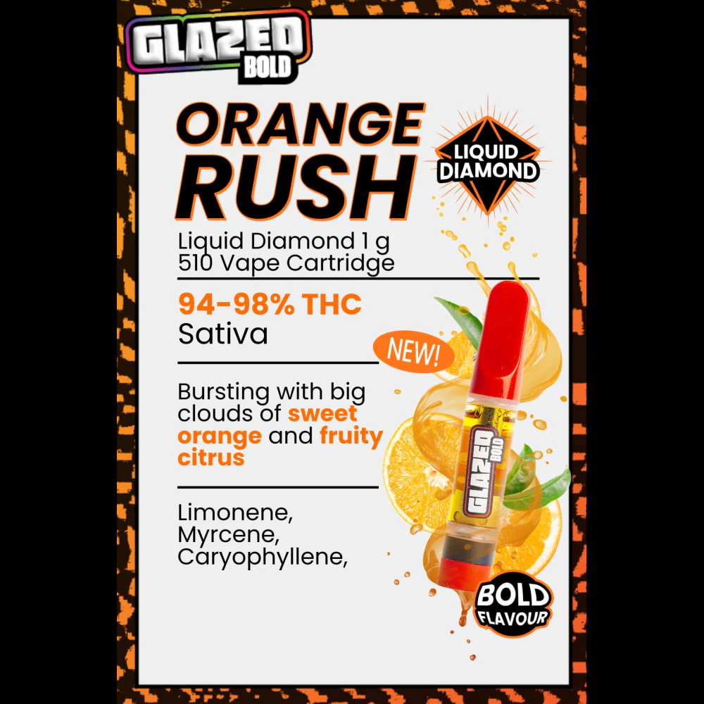 Orange Rush Liquid Diamond is bursting with BOLD flavour, giving big clouds of sweet orange and tangy citrus. This sativa cart combines Orange Rush with caryophyllene, limonene, and myrcene.